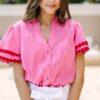 It’s impossible not to look on the bright side while rocking this blouse! That bold print and vibrant colors are sure to lift your spirits and keep you in a good mood all day long! Plus, we love that this blouse is perfect for brightening a day at the office or getting brunch with the girls! Round neckline Button keyhole back Long bubble sleeves with smocked cuffs Ruffled shoulders Colorful abstract print No stretch Savannah is wearing the small.